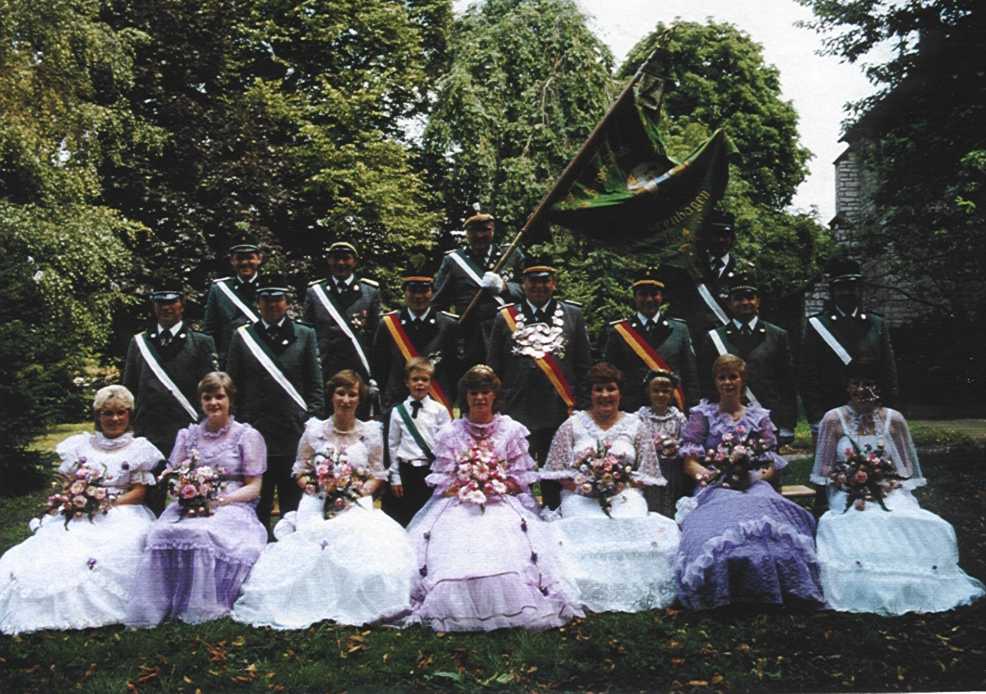 Lothar Hannig und Helga Hannig Hofstaat (von links):Klara und Hans Kuhn, Willi und Änne Ernst, Oswald und Finchen Busch, Lothar und Helga Hannig Theo und Elisabeth Picht, Willi und Maria Hölscher, Bernhard und Erna Striewe Schützen: Josef Schlor, Johannes Düchting, Josef Düchting, Theo Driller, Franz Busch