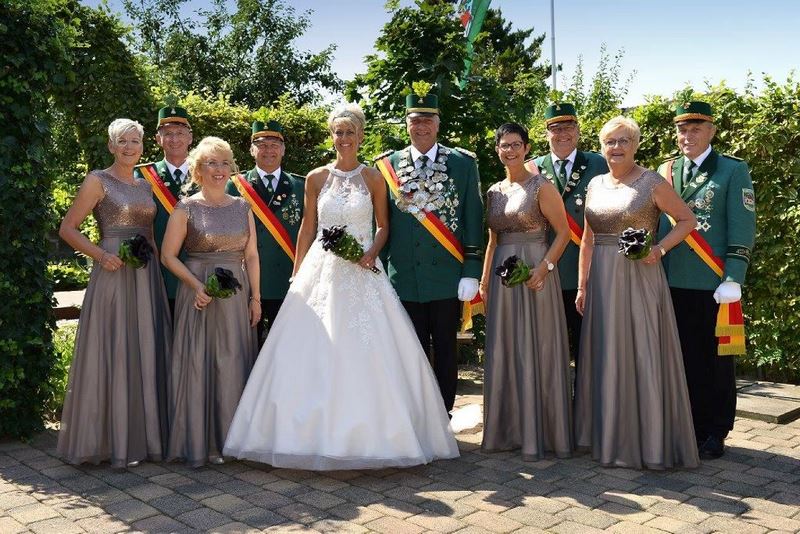 Max und Noëlle Sander Hofstaat (von links): Jonas Düchting und Laura Langlotz, Janik Spottke und Mareen Dömer, Christian Liß und Ina Düchting, Frank und Vera Meyer, Nicolas Amedick und Julia Tillmann, Sven Voß und Laura Eisenbart