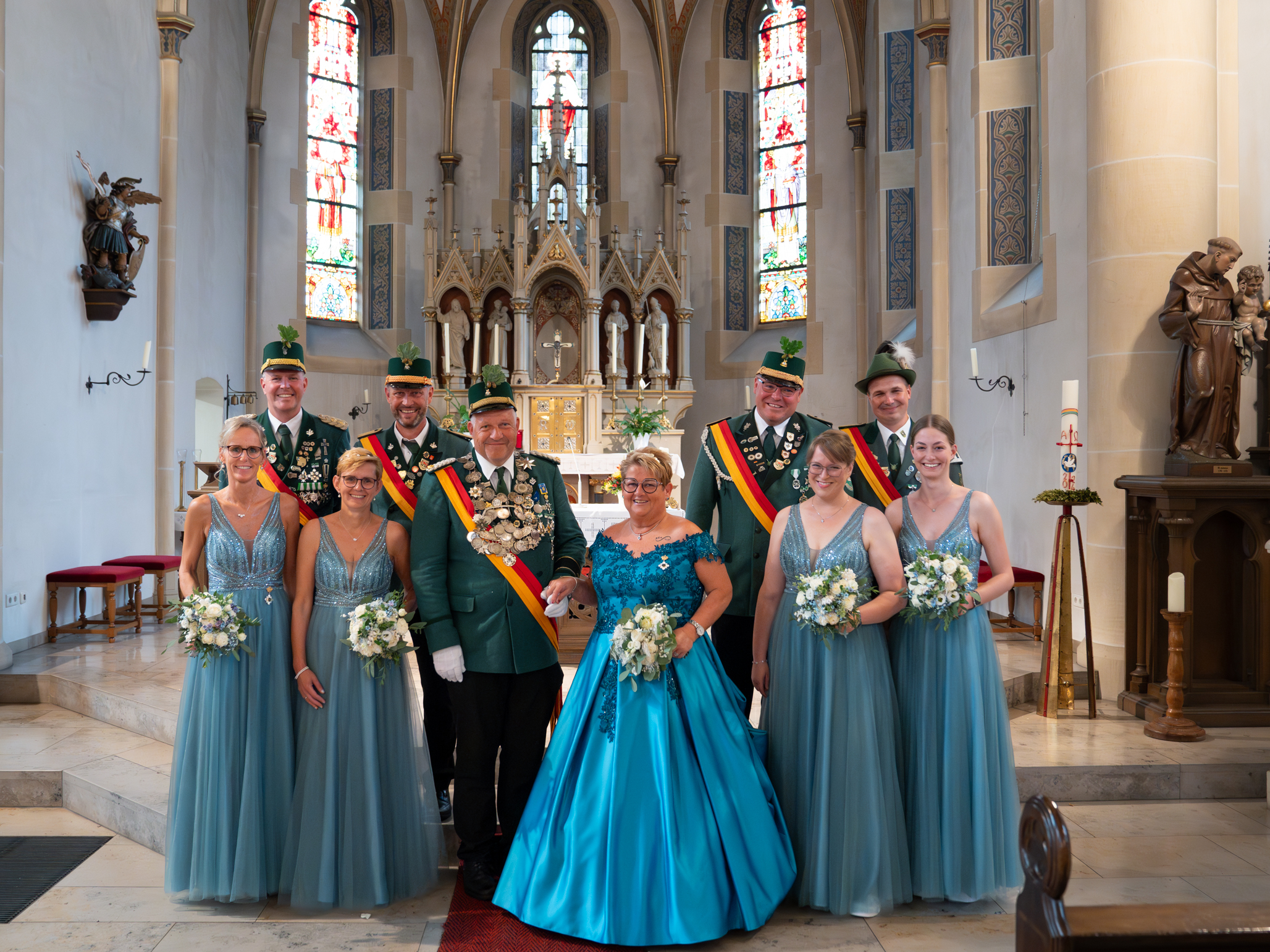 Hofstaat (von links): Martin und Silvia Amedick, Andreas und Miriam Rebbe, Königspaar Carsten und Andrea Höschen, Stefan Ernst und Stefanie Wächter und Florian Overkott und Hanna Tito