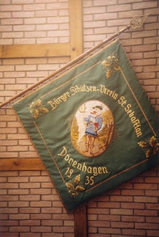 Die Vereinsfahne unserer Bruderschaft stellt ein zentrales Element unseres äußeren Erscheinungsbildes dar und ist bei sämtlichen öffentlichen Auftritten stets präsent. Bereits im Jahr 1935 wurde die erste Fahne angeschafft, die trotz der Wirren des Krieges unversehrt erhalten blieb. Im Laufe der Zeit ließ jedoch der Zustand der Fahne nach, sodass sie 1968 von den „Klarissen-Schwestern“ in Paderborn sorgfältig erneuert wurde. Über die Jahre hinweg zeigte sich erneut der Zahn der Zeit, weshalb 1989 eine umfassende Restaurierung notwendig wurde. Seit dieser letzten Restaurierung wird die Vereinsfahne aus Gründen der Schonung ausschließlich beim großen Festumzug am Sonntagnachmittag mitgeführt. Traditionell übernimmt seitdem der jeweilige Vorjahreshofstaat die ehrenvolle Aufgabe, die Fahne während des Festzuges zu tragen.